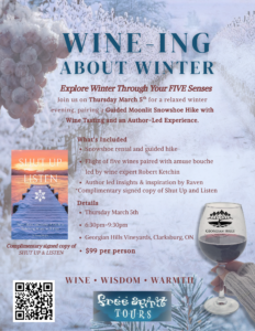 Join us Thursday March 5th for a relaxed winter evening, pairing a Guided Moonlit Snowshoe Hike with Wine Tasting and an Author-Led Experience